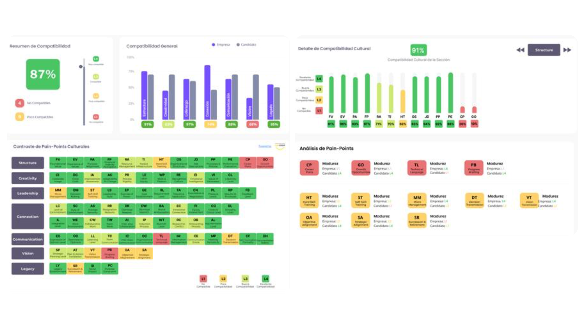 Contamos con el método de mapeo de cultura y análisis de compatibilidad cultural más preciso a nivel global que permite identificar de forma clara el nivel general de compatibilidad que tenga un candidato con la cultura corporativa y los elementos específicos en donde no la haya con la finalidad de tomar decisiones más informadas de contratación.